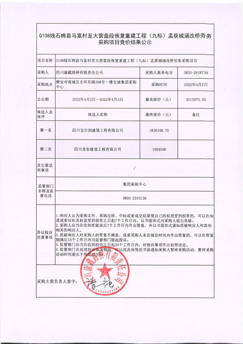 四川康藏路橋有限責任公司G108線石棉縣馬富村至大營盤段恢復重建工程(九標)孟獲城涵改橋勞務(wù)采購項目競價結(jié)果公示