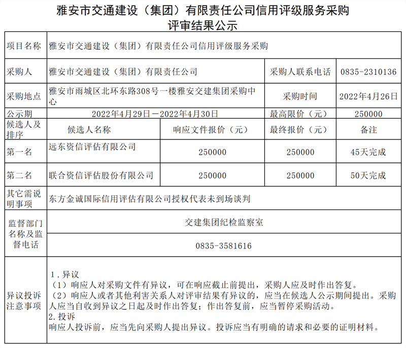 雅安市交通建設(shè)(集團)有限責(zé)任公司信用評級服務(wù)采購評審結(jié)果公示
