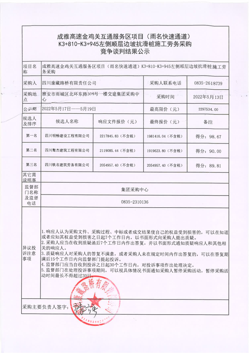 四川康藏路橋有限責任公司成雅高速金雞關(guān)互通服務(wù)區(qū)項目(雨名快速通道)K3+810-K3+945左側(cè)順層邊坡抗滑樁施工勞務(wù)采購競爭談判結(jié)果公示