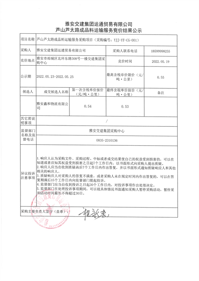 雅安交建集團運通貿(mào)易有限公司蘆山蘆太路成品料運輸服務競價結(jié)果公示