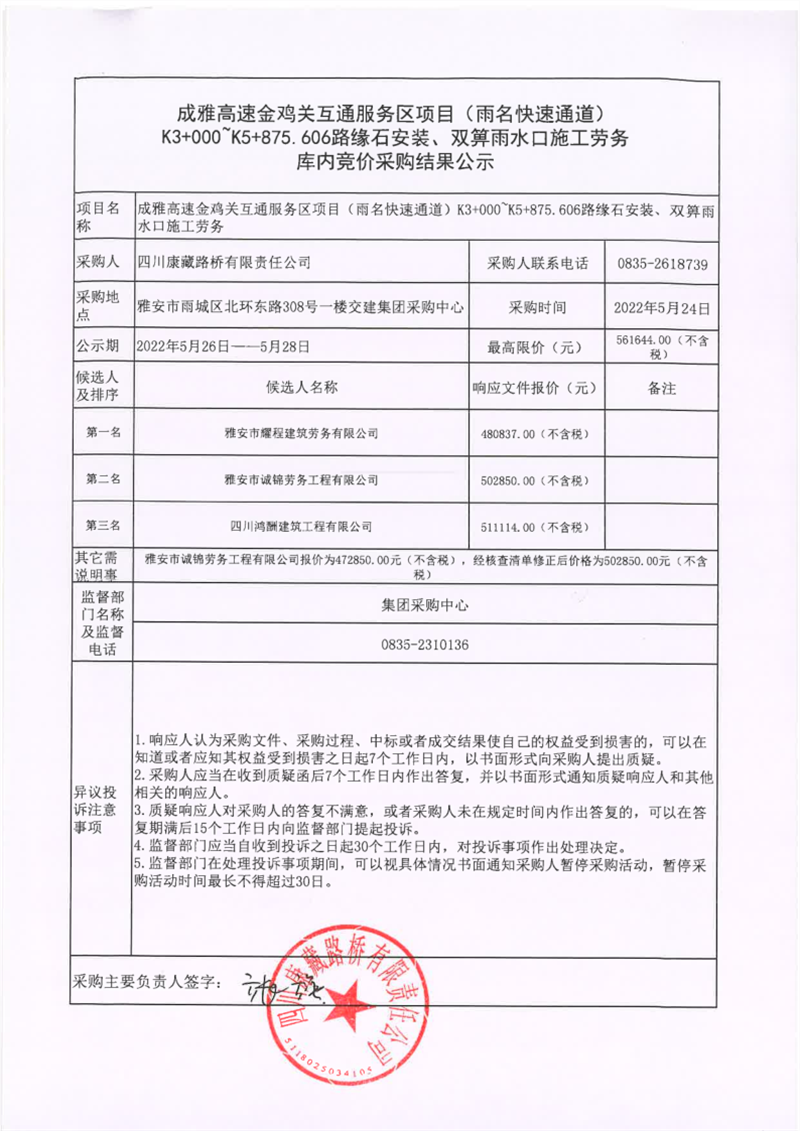 四川康藏路橋有限責任公司成雅高速金雞關互通服務區(qū)項目(雨名快速通道)K3+000~K5+875.606路緣石安裝、雙箅雨水口施工勞務庫內競價采購結果公示