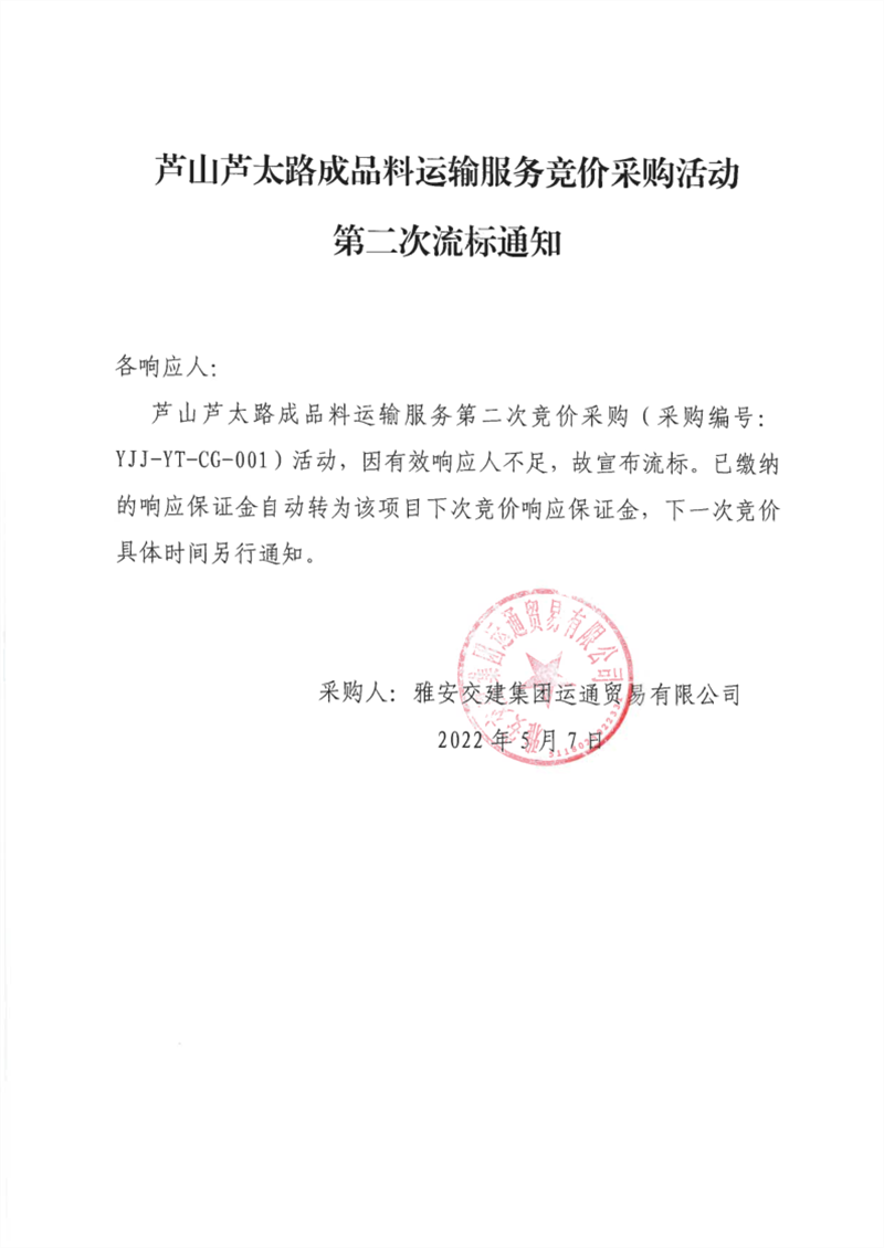 雅安交建集團運通貿易有限公司蘆山蘆太路成品料運輸服務競價采購活動第二次流標通知