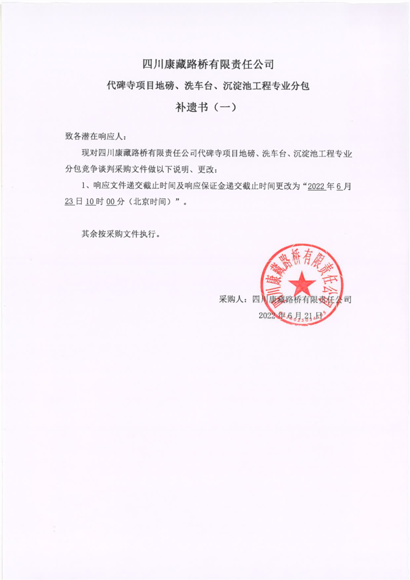 四川康藏路橋有限責(zé)任公司代碑寺項(xiàng)目地磅、洗車臺(tái)、沉淀池工程專業(yè)分包補(bǔ)遺書(一)