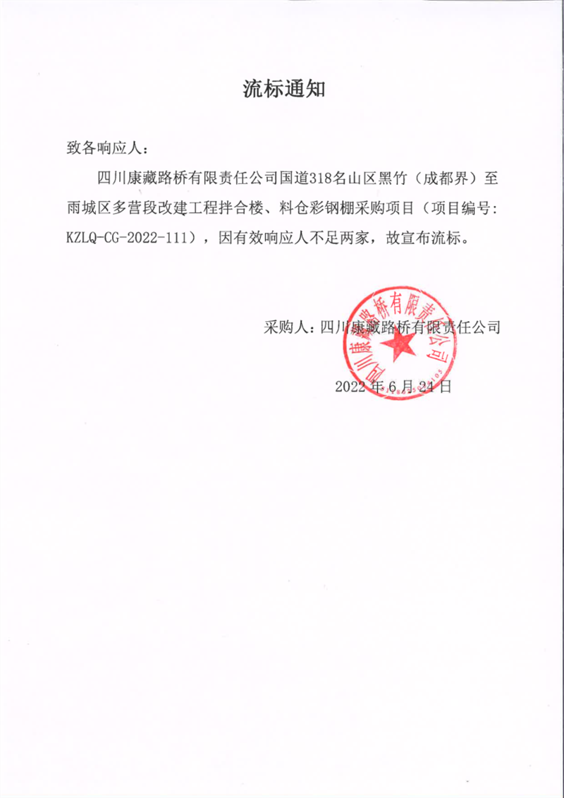 四川康藏路橋有限責(zé)任公司國(guó)道318名山區(qū)黑竹(成都界)至雨城區(qū)多營(yíng)段改建工程拌合樓、料倉彩鋼棚采購(gòu)項(xiàng)目流標(biāo)通知