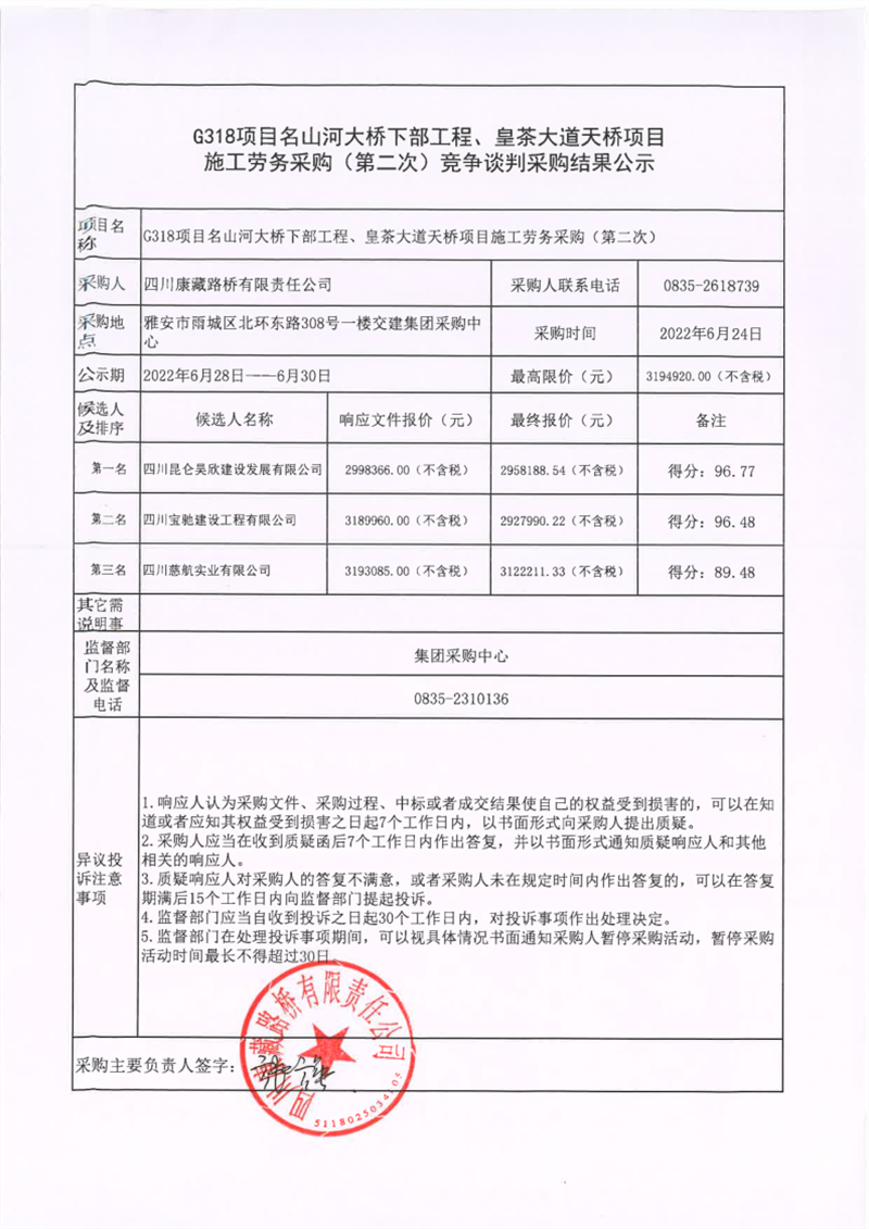 四川康藏路橋有限責(zé)任公司G318項目名山河大橋下部工程、皇茶大道天橋項目施工勞務(wù)采購(第二次)競爭談判采購結(jié)果公示