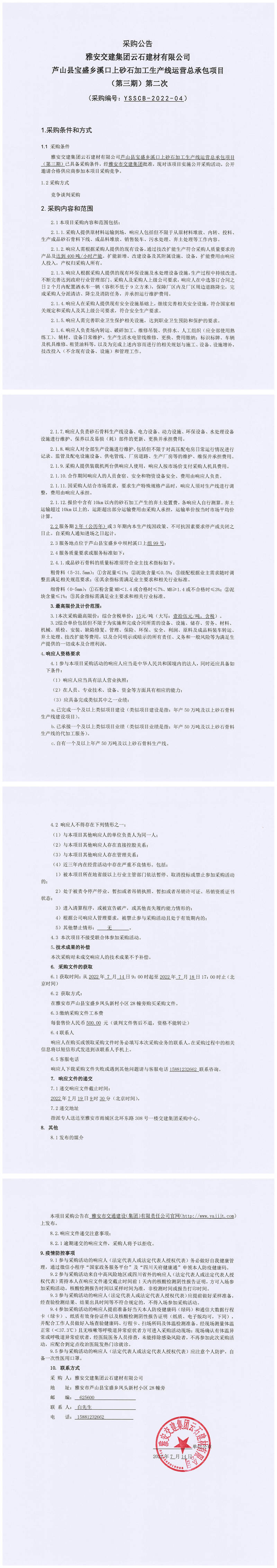 雅安交建集團(tuán)云石建材有限公司蘆山縣寶盛鄉(xiāng)溪口上砂石加工生產(chǎn)線運(yùn)營總承包項(xiàng)目(第三期)第二次采購公告