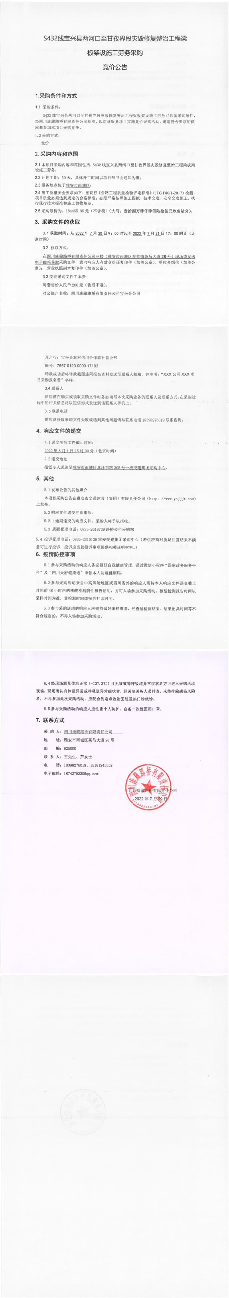 四川康藏路橋有限責任公司S432線寶興縣兩河口至甘孜界段災(zāi)毀修復整治工程梁板架設(shè)施工勞務(wù)采購競價公告