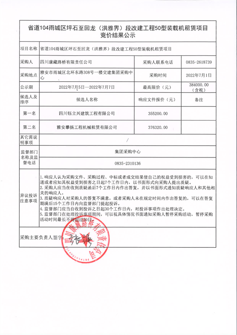 四川康藏路橋有限責(zé)任公司省道104雨城區(qū)坪石至回龍(洪雅界)段改建工程50型裝載機(jī)租賃項(xiàng)目競(jìng)價(jià)結(jié)果公示