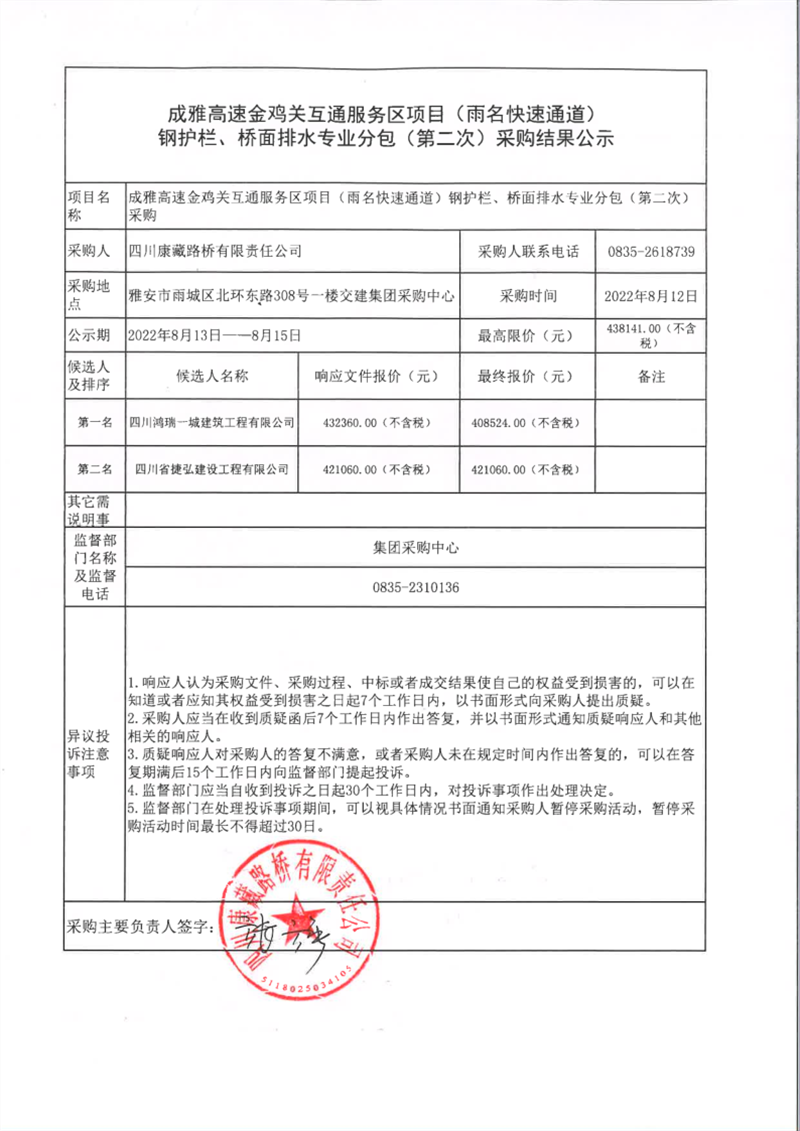 四川康藏路橋有限責(zé)任公司成雅高速金雞關(guān)互通服務(wù)區(qū)項(xiàng)目(雨名快速通道)鋼護(hù)欄、橋面排水專業(yè)分包(第二次)采購結(jié)果公示