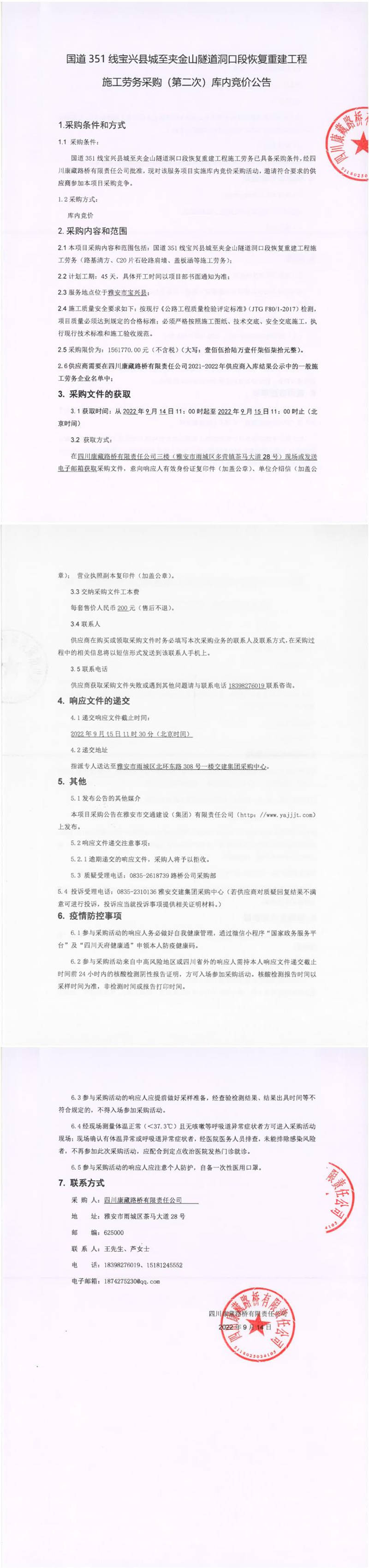 四川康藏路橋有限責任公司國道351線寶興縣城至夾金山隧道洞口段恢復重建工程施工勞務采購(第二次)庫內競價公告