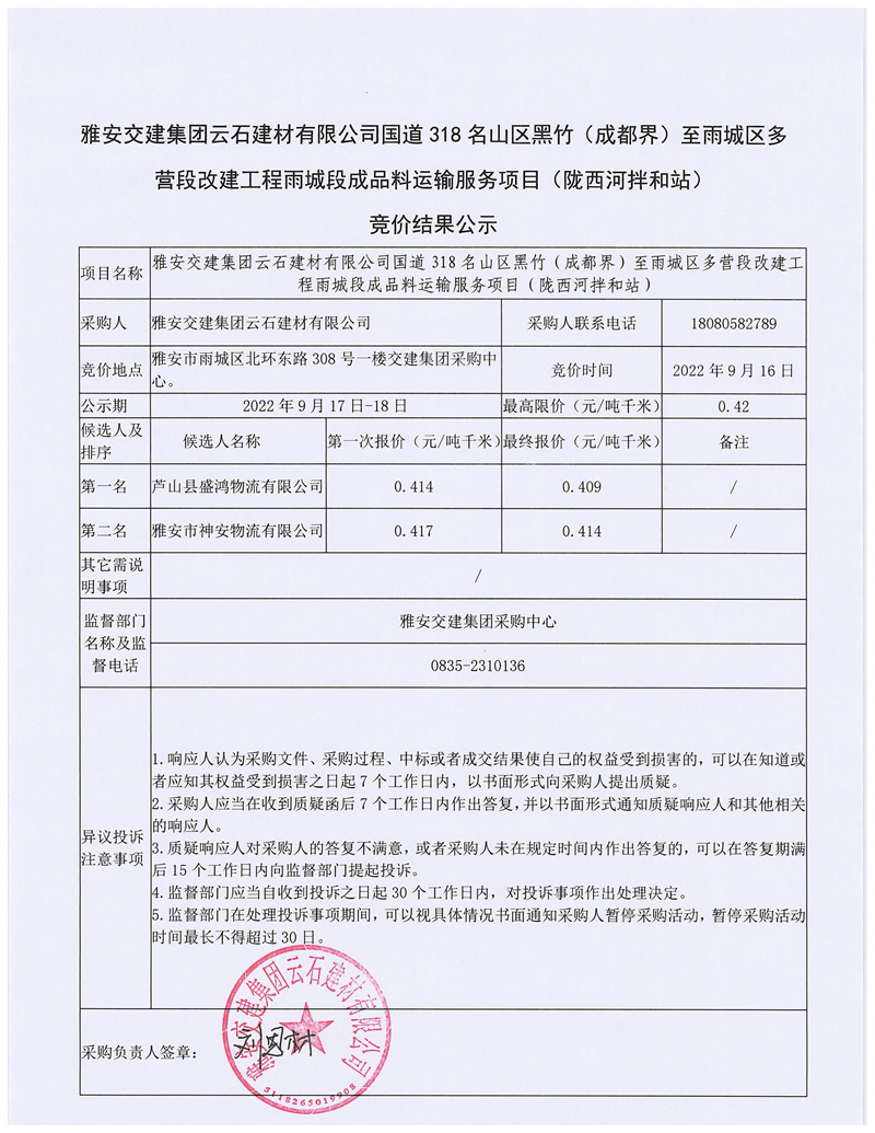 雅安交建集團云石建材有限公司國道318名山區(qū)黑竹(成都界)至雨城區(qū)多營段改建工程雨城段成品料運輸服務項目(隴西河拌和站)競價結果公示