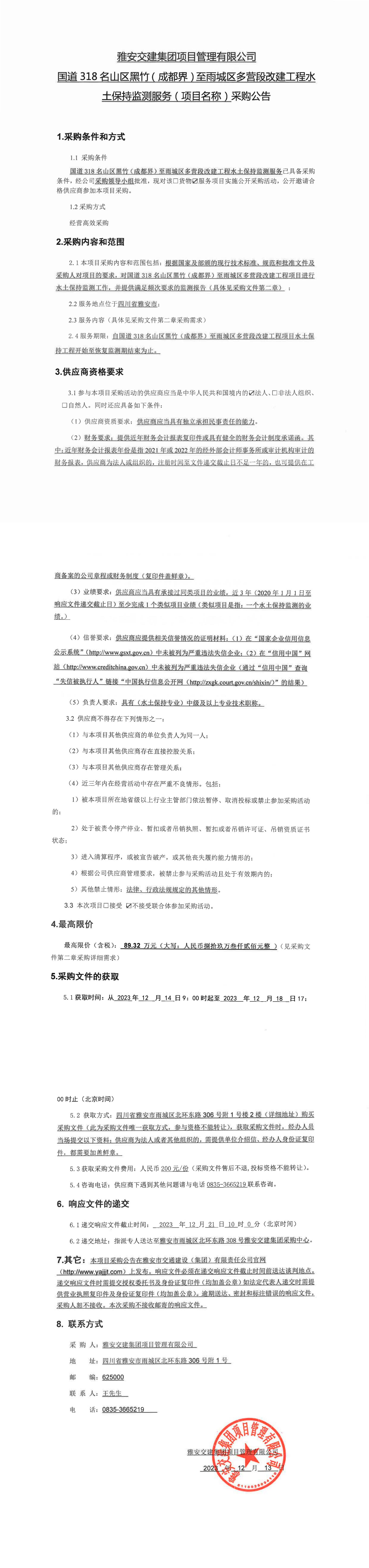 雅安交建集團項目管理有限公司國道318名山區(qū)黑竹(成都界)至雨城區(qū)多營段改建工程水土保持監(jiān)測服務(wù)(項目名稱)采購公告