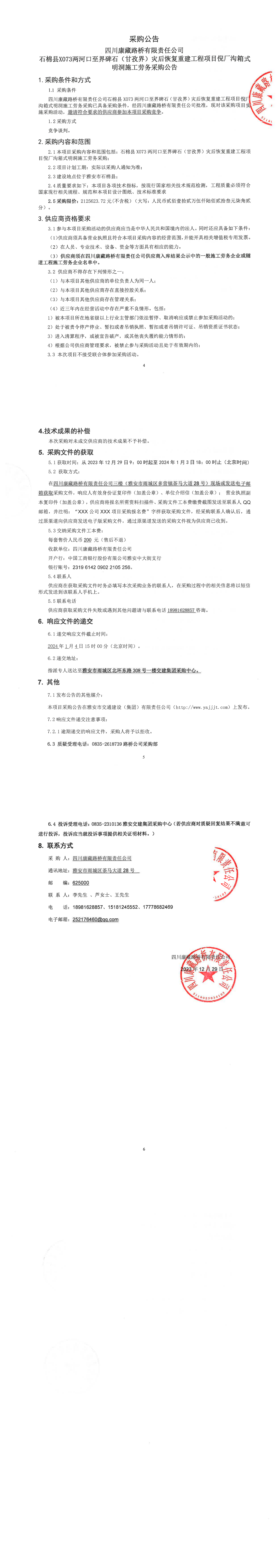 四川康藏路橋有限責任公司石棉縣X073兩河口至界碑石(甘孜界)災后恢復重建工程項目倪廠溝箱式明洞施工勞務采購公告