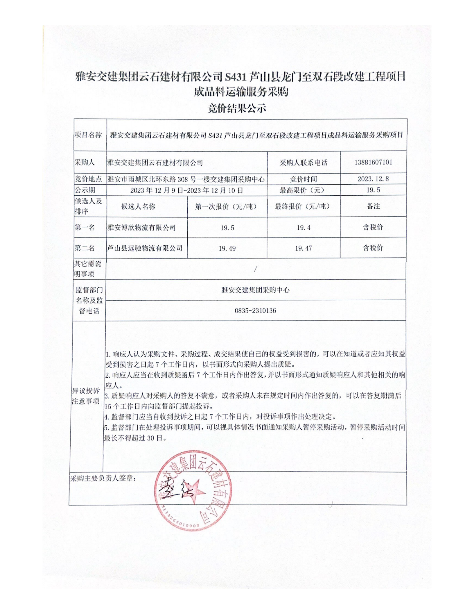 雅安交建集團云石建材有限公司S431蘆山縣龍門至雙石段改建工程項目成品料運輸服務采購競價結(jié)果公示