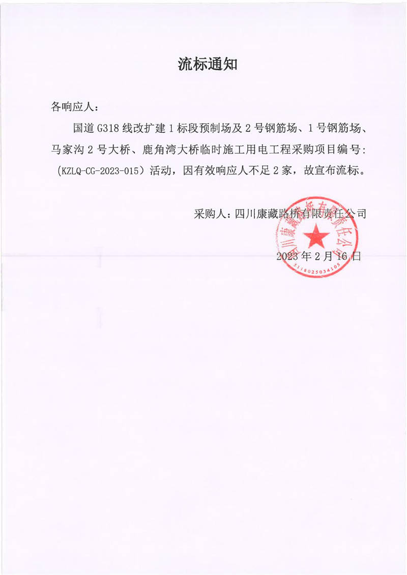 四川康藏路橋有限責任公司國道G318線改擴建1標段預(yù)制場及2號鋼筋場、1號鋼筋場、馬家溝2號大橋、鹿角灣大橋臨時施工用電工程采購項目流標通知