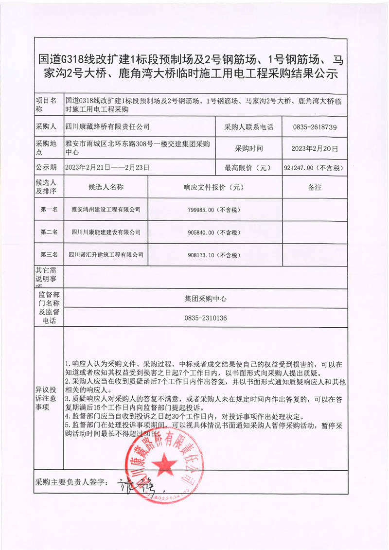 四川康藏路橋有限責(zé)任公司國道318線改擴(kuò)建1標(biāo)段預(yù)制場及2號鋼筋場、1號鋼筋場、馬家溝2號大橋、鹿角灣大橋臨時(shí)施工用電工程采購結(jié)果公示