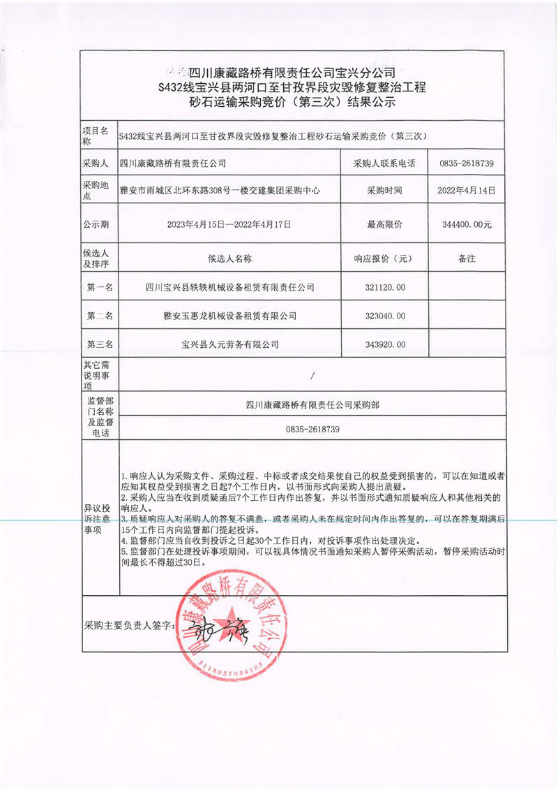 四川康藏路橋有限責(zé)任公司寶興分公司S432線寶興縣兩河口至甘孜界段災(zāi)毀修復(fù)整治工程砂石運(yùn)輸采購競價(第三次)結(jié)果公示
