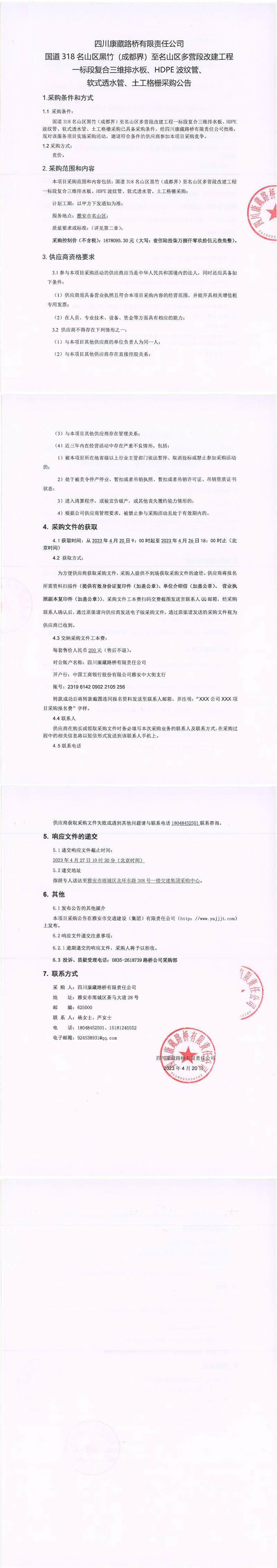 四川康藏路橋有限責任公司國道318名山區(qū)黑竹(成都界)至雨城區(qū)多營段改建工程一標段復(fù)合三維排水板、HDPE波紋管、軟式透水管、土工格柵采購公告