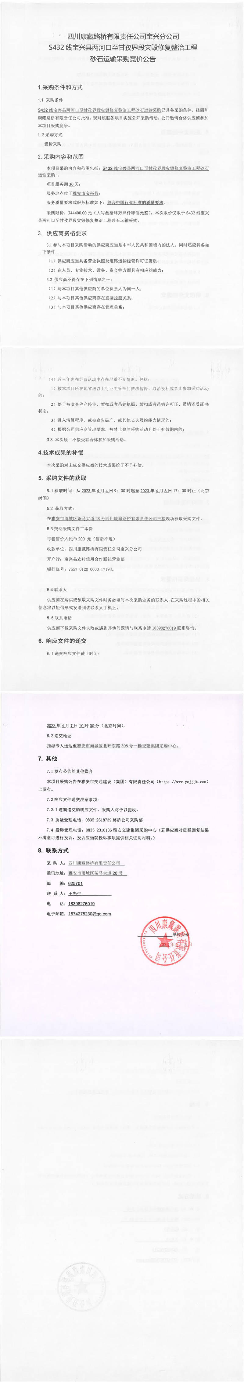 四川康藏路橋有限責(zé)任公司寶興分公司S432寶興縣兩河口至甘孜界段災(zāi)毀修復(fù)整治工程砂石運(yùn)輸采購競價(jià)公告