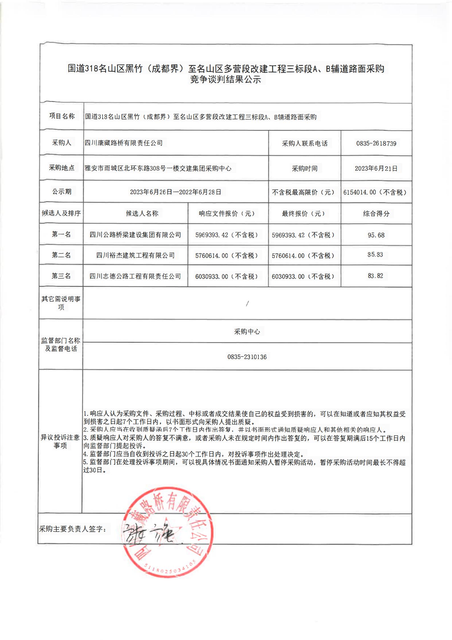 四川康藏路橋有限責任公司國道318名山區(qū)黑竹(成都界)至雨城區(qū)多營段改建工程三標段A、B輔道路面采購競爭談判結(jié)果公示