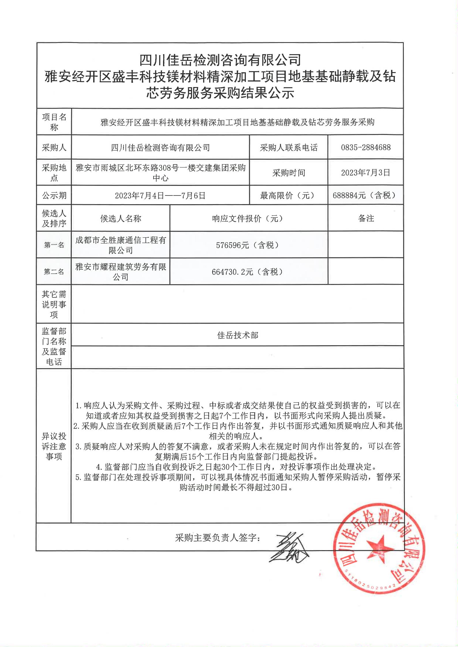 四川佳岳檢測咨詢有限公司雅安經(jīng)開區(qū)盛豐科技鎂材料精深加工項目地基基礎(chǔ)靜載及鉆芯服務(wù)采購結(jié)果公示