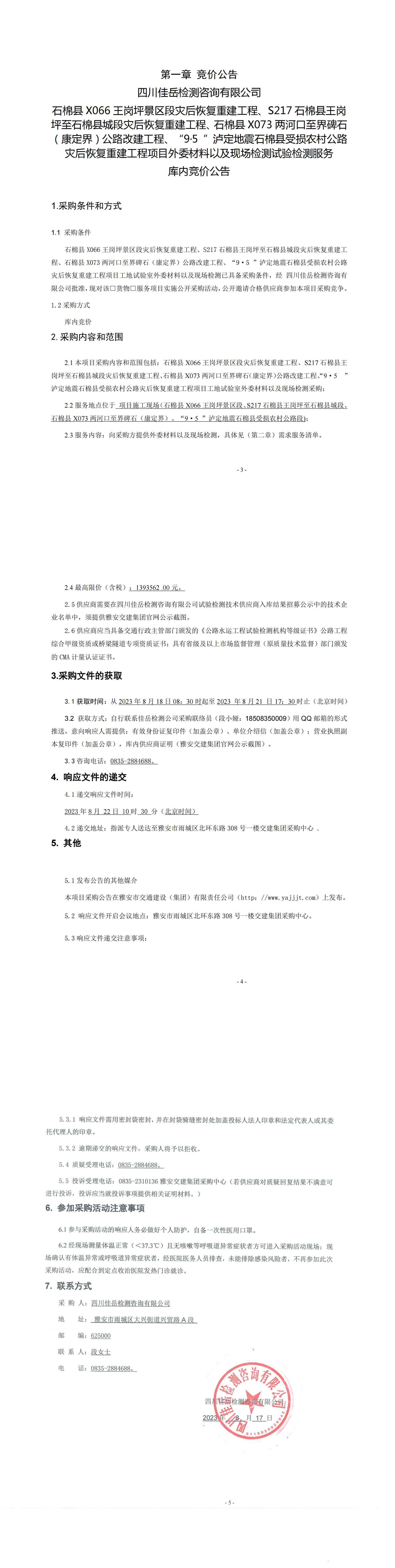 四川佳岳檢測(cè)咨詢有限公司石棉縣X066王崗坪至王崗坪景區(qū)段災(zāi)后恢復(fù)重建工程、S217石棉縣王崗坪至石棉縣城段災(zāi)后恢復(fù)重建工程、石棉縣X073兩河口至界碑石(康定界)公路改建工程、“9·5”瀘定地震石棉縣受損農(nóng)村公路災(zāi)后恢復(fù)重建工程項(xiàng)目外委材料以及現(xiàn)場(chǎng)檢測(cè)試驗(yàn)檢測(cè)服務(wù)庫內(nèi)競(jìng)價(jià)公告