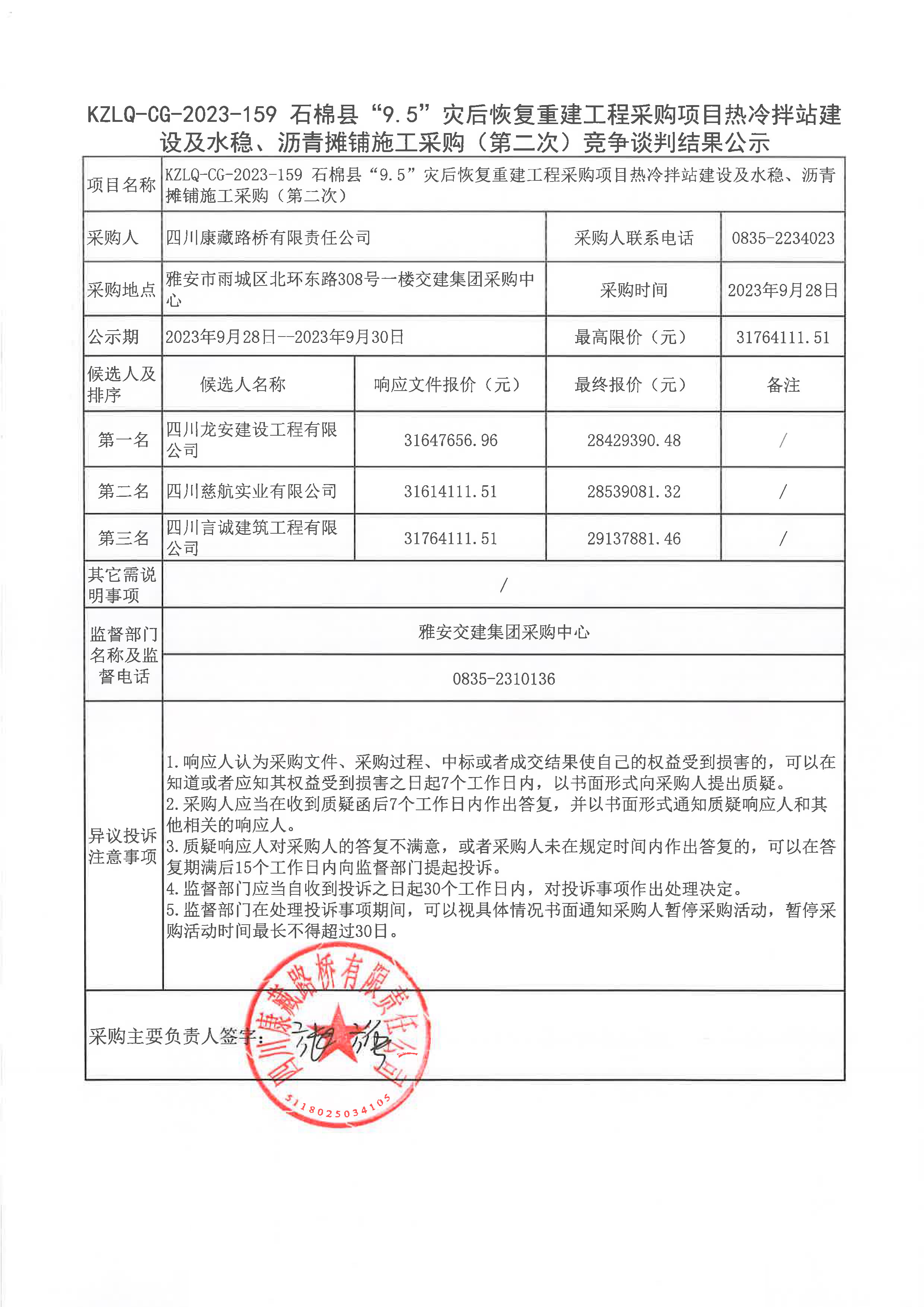 四川康藏路橋有限責(zé)任公司石棉縣“9.5”災(zāi)后恢復(fù)重建工程采購項目熱冷拌站建設(shè)及水穩(wěn)、瀝青攤鋪施工采購(第二次)競爭談判結(jié)果公示