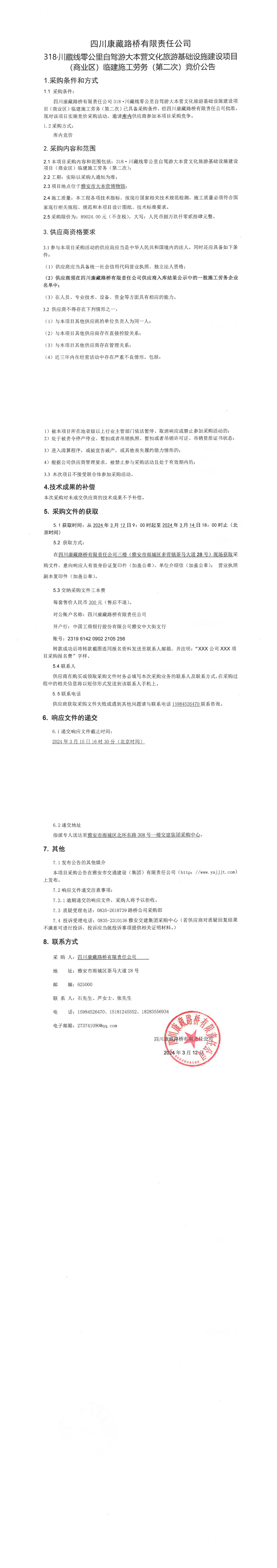 四川康藏路橋有限責(zé)任公司318·川藏公路零公里自駕游大本營文化旅游基礎(chǔ)設(shè)施建設(shè)項(xiàng)目(商業(yè)區(qū))臨建施工勞務(wù)(第二次)競價(jià)公告