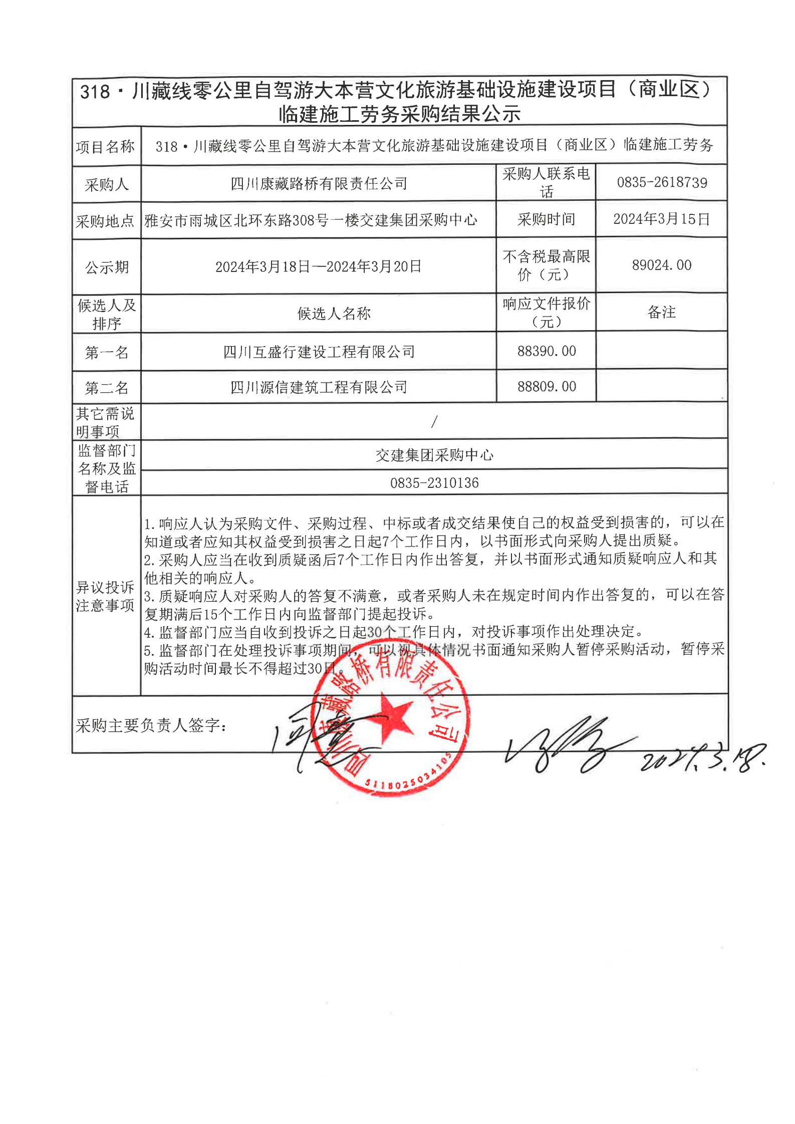 四川康藏路橋有限責任公司318·川藏線零公里自駕游大本營文化旅游基礎(chǔ)設(shè)施建設(shè)項目(商業(yè)區(qū))臨建施工勞務(wù)結(jié)果公示