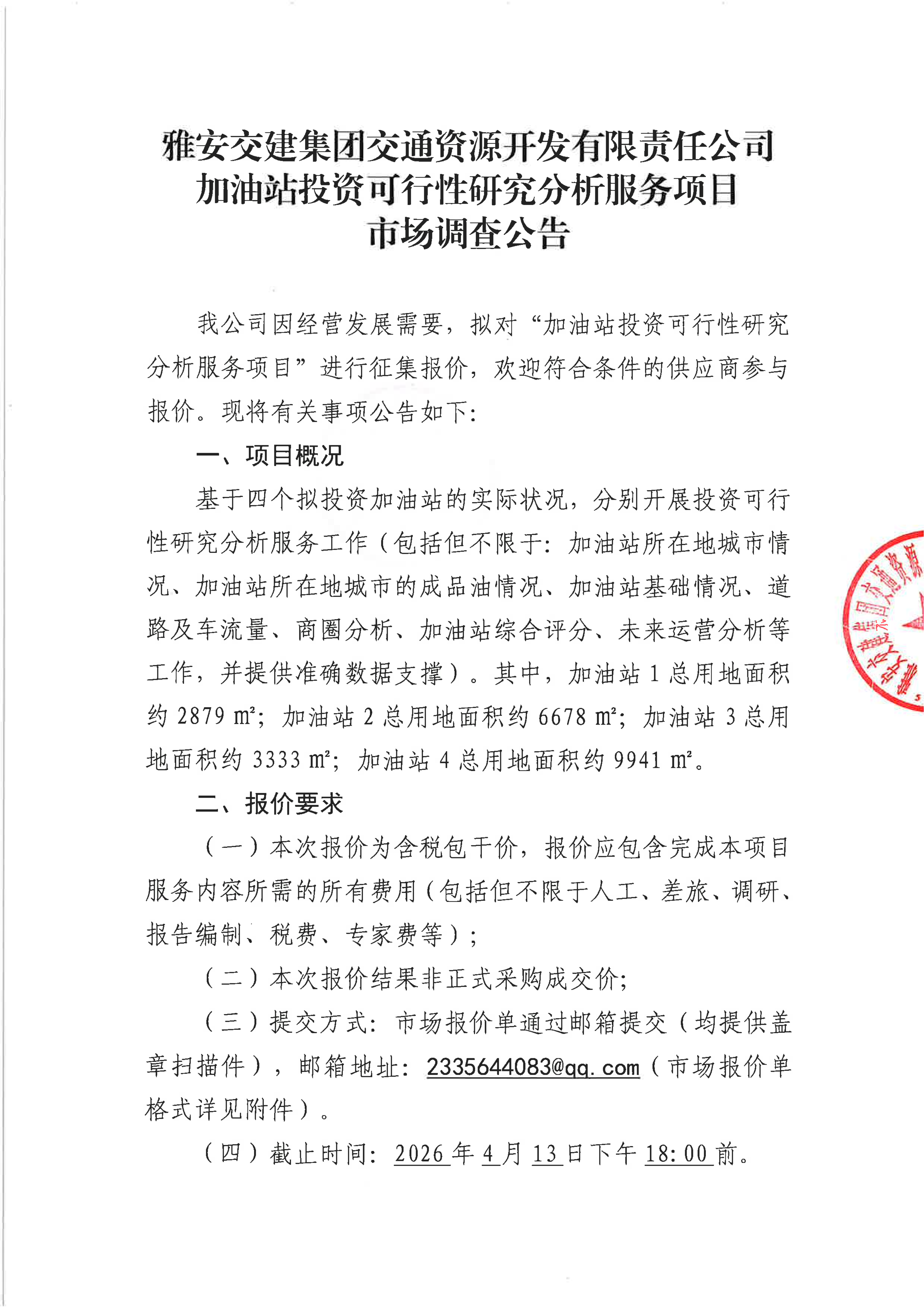 雅安交建集團交通資源開發(fā)有限責任公司加油站投資可行性研究分析服務項目市場調查公告