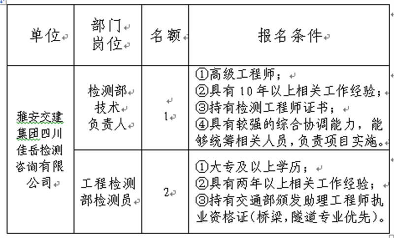 根據(jù)發(fā)展需要,決定面向社會(huì)公開招聘雅安市交通建設(shè)(集團(tuán))有限責(zé)任公司(以下簡稱“雅安交建集團(tuán)”)所屬子公司工作人員3名,現(xiàn)將有關(guān)事項(xiàng)公告如下: