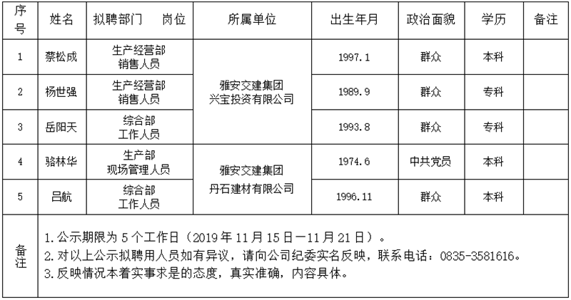雅安交建集團所屬子公司擬聘用人員公示(興寶公司、丹石公司)