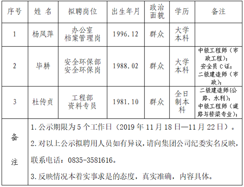 通過公開報名、資格審查、面試等程序,經(jīng)雅安交建集團資產(chǎn)經(jīng)營管理有限公司研究擇優(yōu)確定以下3名擬聘用人員,現(xiàn)公示名單如下: