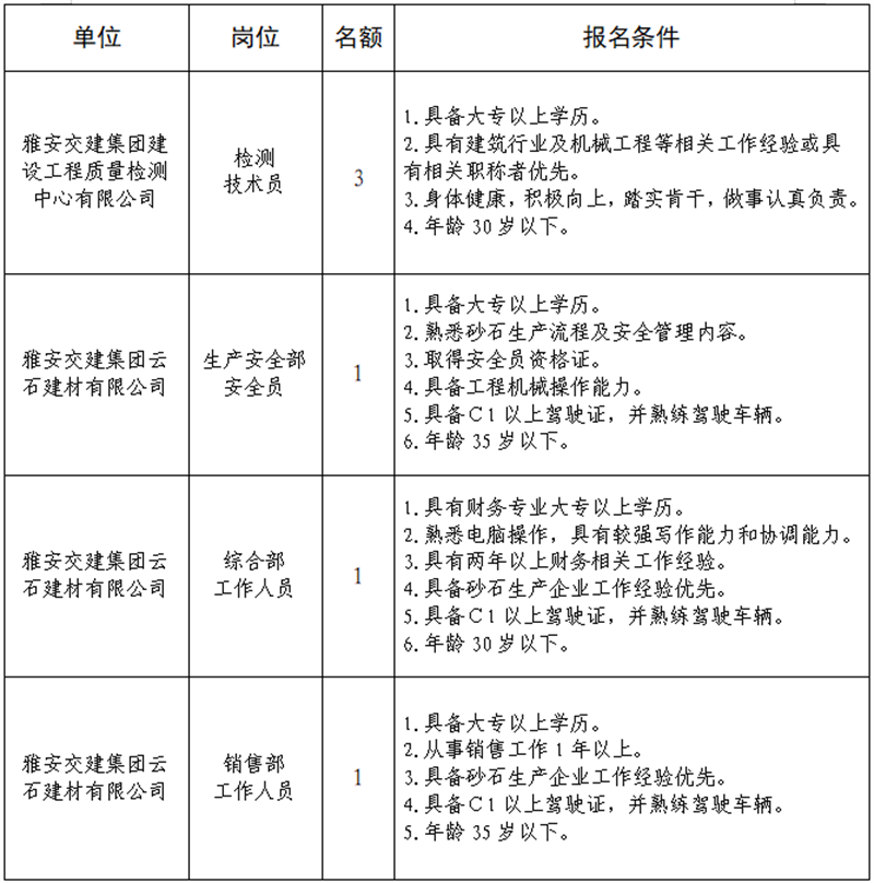 根據(jù)發(fā)展需要,決定面向社會公開招聘雅安市交通建設(shè)(集團(tuán))有限責(zé)任公司(以下簡稱“雅安交建集團(tuán)”)所屬子公司工作人員6名,現(xiàn)將有關(guān)事項(xiàng)公告如下: