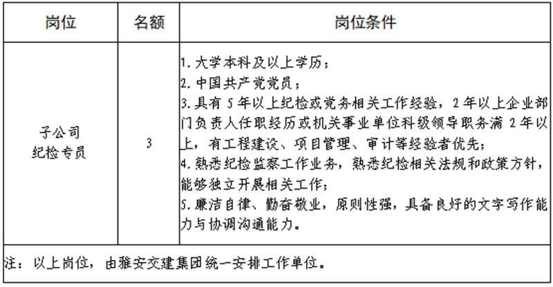 根據(jù)發(fā)展需要,決定面向社會公開招聘雅安市交通建設(shè)(集團(tuán))有限責(zé)任公司(以下簡稱“雅安交建集團(tuán)”)所屬子公司紀(jì)檢專員3名,現(xiàn)將有關(guān)事項(xiàng)公告如下: