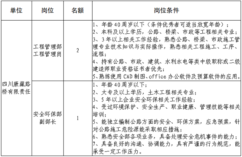 根據(jù)發(fā)展需要,決定面向社會(huì)公開招聘雅安市交通建設(shè)(集團(tuán))有限責(zé)任公司(以下簡稱“雅安交建集團(tuán)”)所屬子公司相關(guān)人員3名,現(xiàn)將有關(guān)事項(xiàng)公告如下: