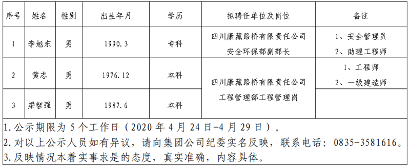 雅安交建集團(tuán)關(guān)于擬聘用所屬子公司工作人員公示(路橋公司)