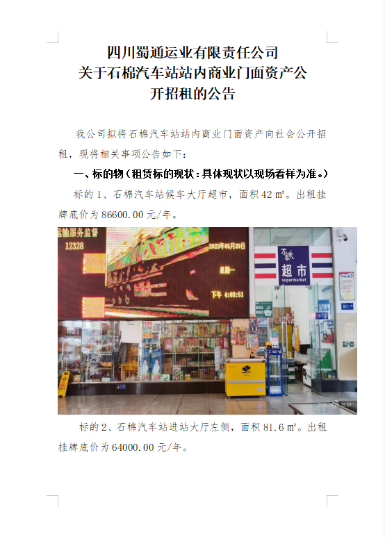 四川蜀通運(yùn)業(yè)有限責(zé)任公司關(guān)于石棉汽車站站內(nèi)商業(yè)門(mén)面資產(chǎn)公開(kāi)招租的公告