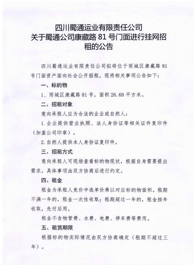ËÄ´¨Êñͨß\(y¨´n)˜I(y¨¨)ÓÐÏÞØŸ(z¨¦)Èι«Ë¾êP(gu¨¡n)ÓÚÊñͨ¹«Ë¾¿µ²ØÂ·81Ì–(h¨¤o)éTÃæßM(j¨¬n)ÐÐ’ì¾W(w¨£ng)ÕÐ×âµÄ¹«¸æ£º¸½¼þ