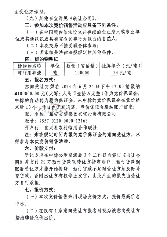 雅安交建集團(tuán)興寶投資有限公司寶興縣靈關(guān)鎮(zhèn)代碑寺土地整理項(xiàng)目10萬(wàn)噸可利用棄渣競(jìng)價(jià)銷售公告(2024.6.21)
