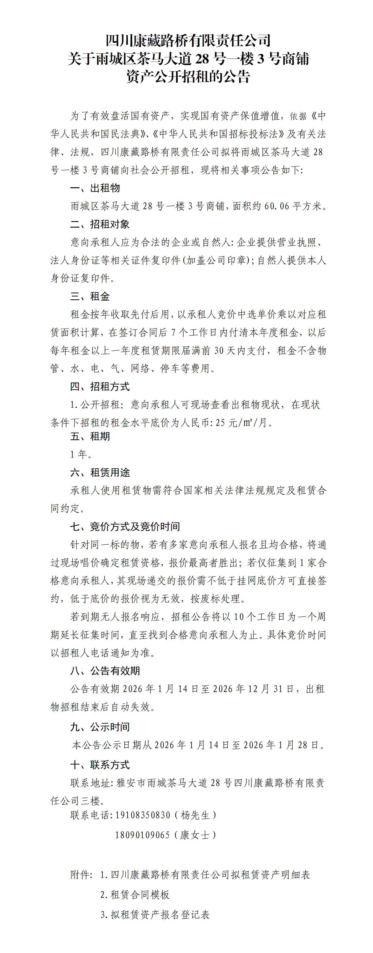 四川康藏路橋有限責(zé)任公司關(guān)于雨城區(qū)茶馬大道28號一樓3號商鋪 資產(chǎn)公開招租的公告