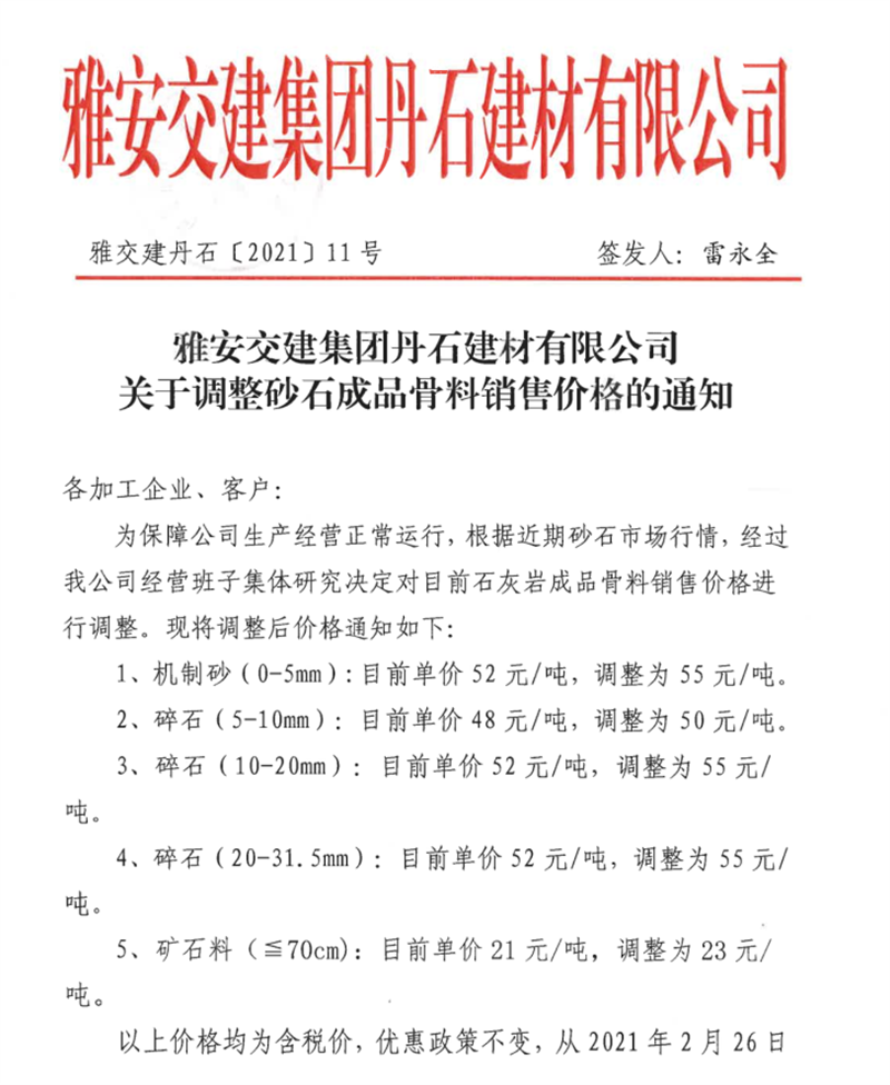 雅安交建集團(tuán)丹石公司石灰?guī)r成品骨料掛牌價(jià)(2021.2.25)