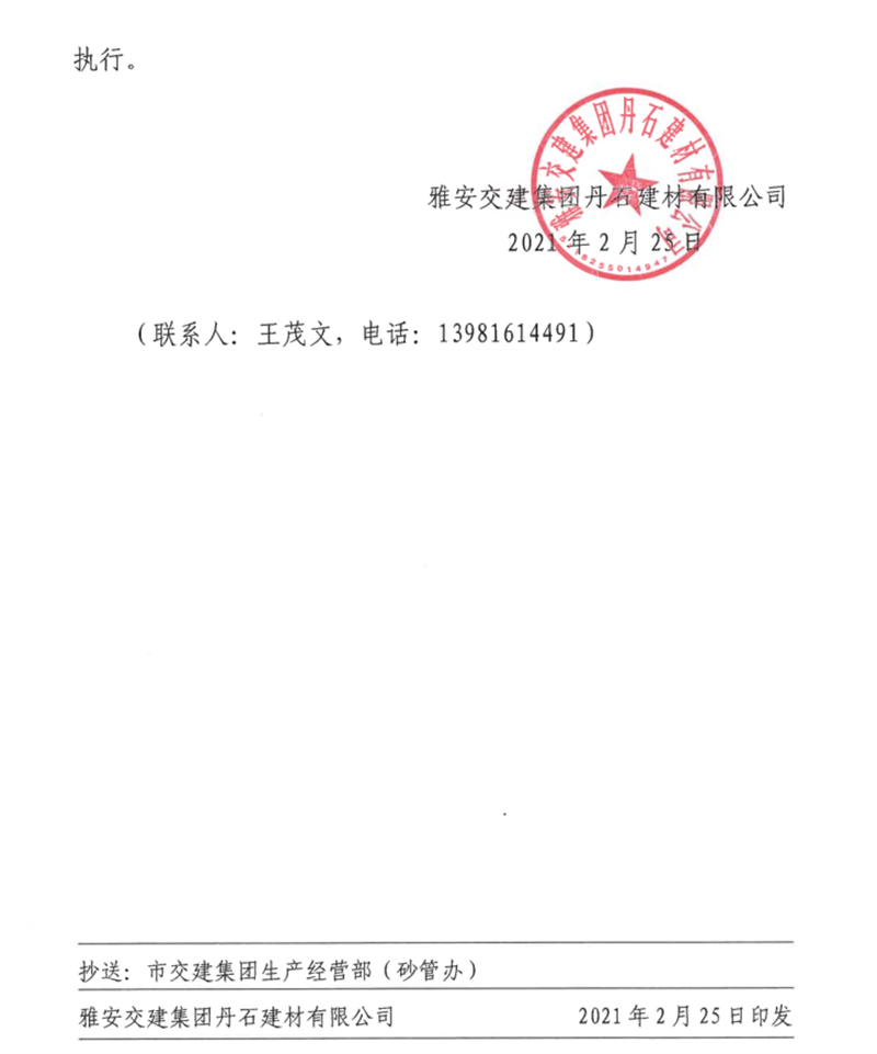 雅安交建集團(tuán)云石公司砂石骨料銷售價(jià)格情況表(2021.6.20)