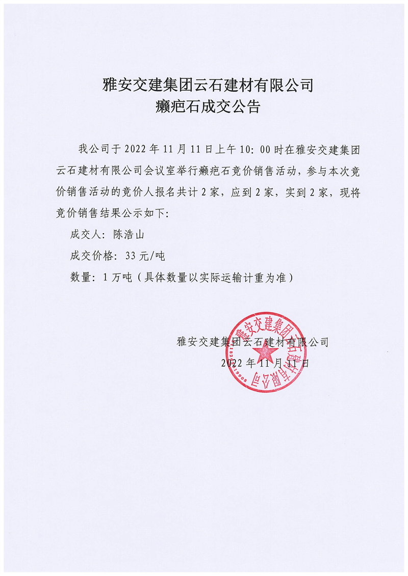 雅安交建集團云石建材有限公司癩疤石成交公告11.11