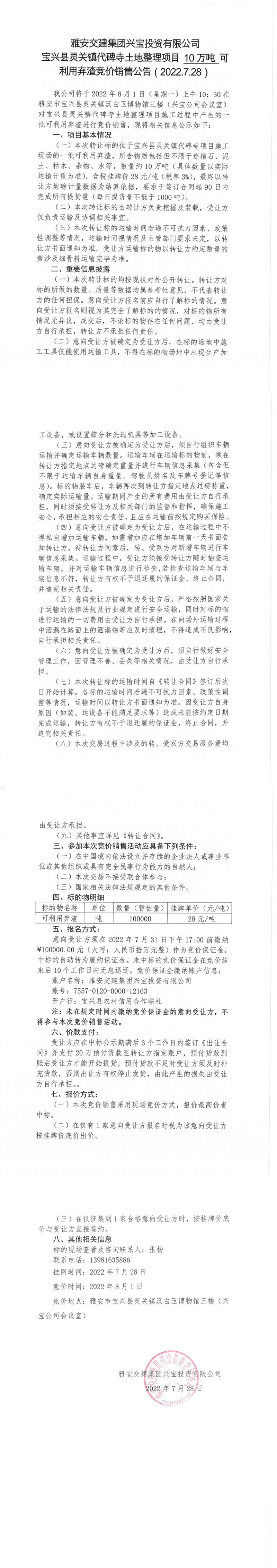 雅安交建集團(tuán)興寶投資有限公司靈關(guān)鎮(zhèn)代碑寺土地整理項目5萬噸可利用棄渣競價銷售成交公告(2022.8.1)