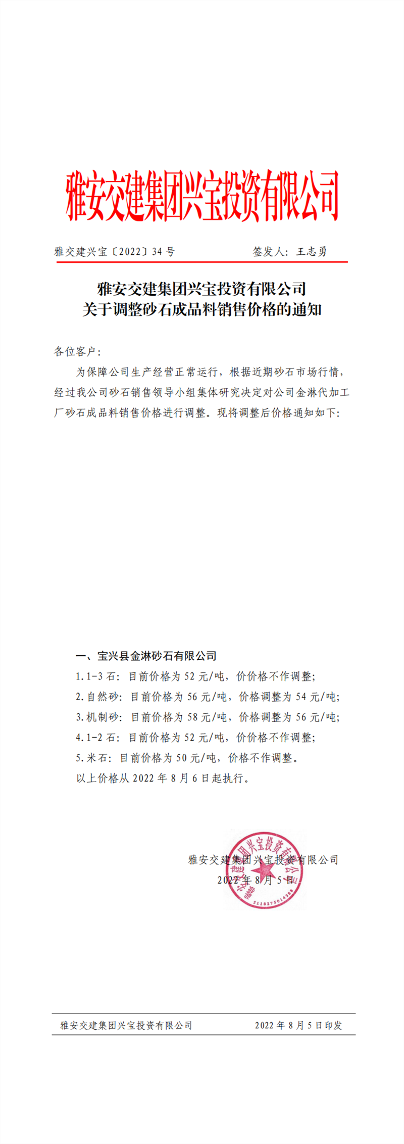雅交建興寶〔2022〕34號(hào) 關(guān)于調(diào)整砂石成品料銷售價(jià)格的通知