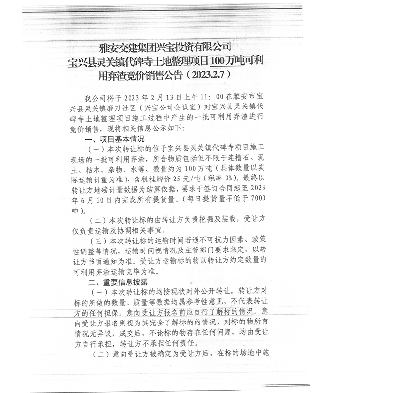 雅安交建集團(tuán)興寶投資有限公司100萬噸可利用棄渣競價(jià)銷售流標(biāo)公告(2023.2.13)