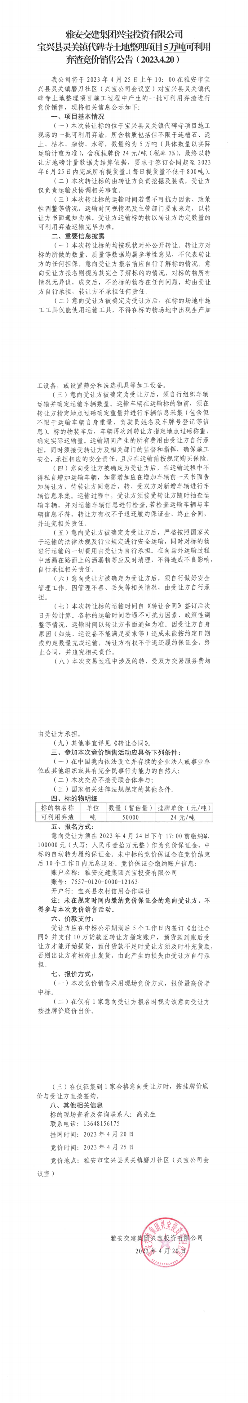 雅安交建集團(tuán)興寶投資有限公司靈關(guān)鎮(zhèn)代碑寺土地整理項目5萬噸可利用棄渣競價銷售公告(2023.4.20)